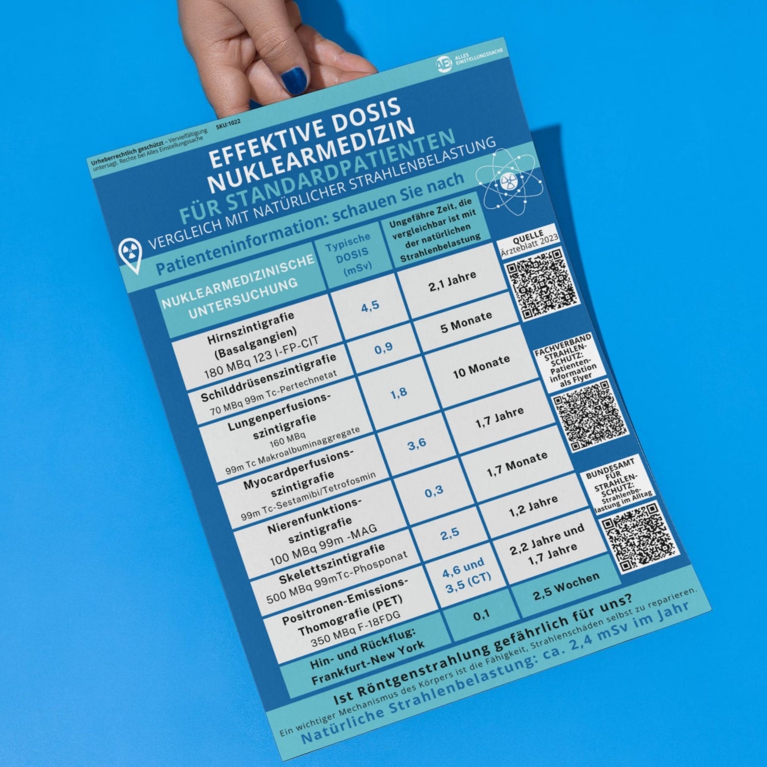 Diese laminierte A4-Tabelle bietet Patienten eine klare und verständliche Übersicht über die Strahlenexposition verschiedener Röntgenuntersuchungen. Durch den direkten Vergleich mit der natürlichen Strahlenbelastung hilft sie, die medizinische Strahlendosis besser einzuordnen.